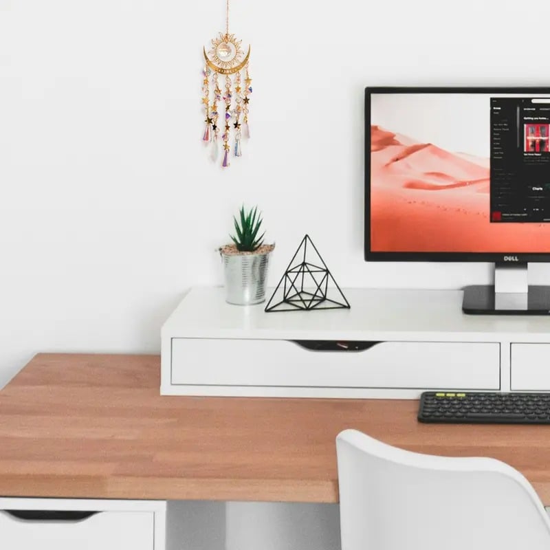 🌈Szivárvány készítő: A Suncatcher csillogó fémkeret nap-, hold- és csillagmintákkal. A mesterséges kristályok és medálok felfogják a napfényt, álomszerű fény-árnyék hatást keltve. lEgyedi design, finom kivitelezés és erős dekorativitás teszi magával ragadó műalkotássá.