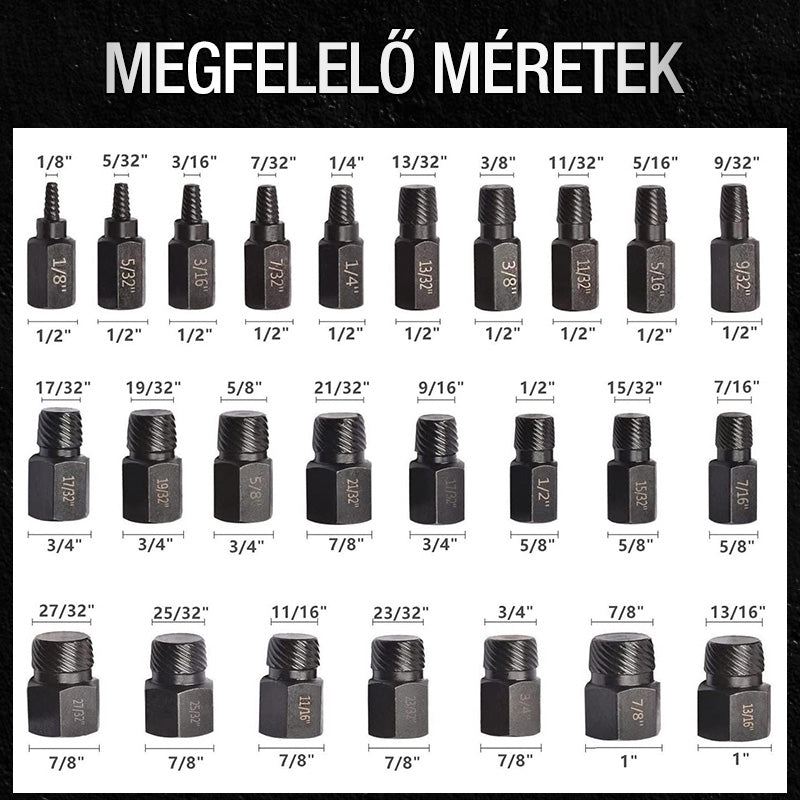 Mindig legyen nálad a megfelelő kihúzófej, ha törött vagy befagyott csavarokkal kell foglalkoznod. Ez a készlet 1/8"-től 7/8"-ig tartalmaz kihúzószerszámokat, és minden darab lézerrel bevésett jelöléssel rendelkezik a könnyű azonosítás érdekében.