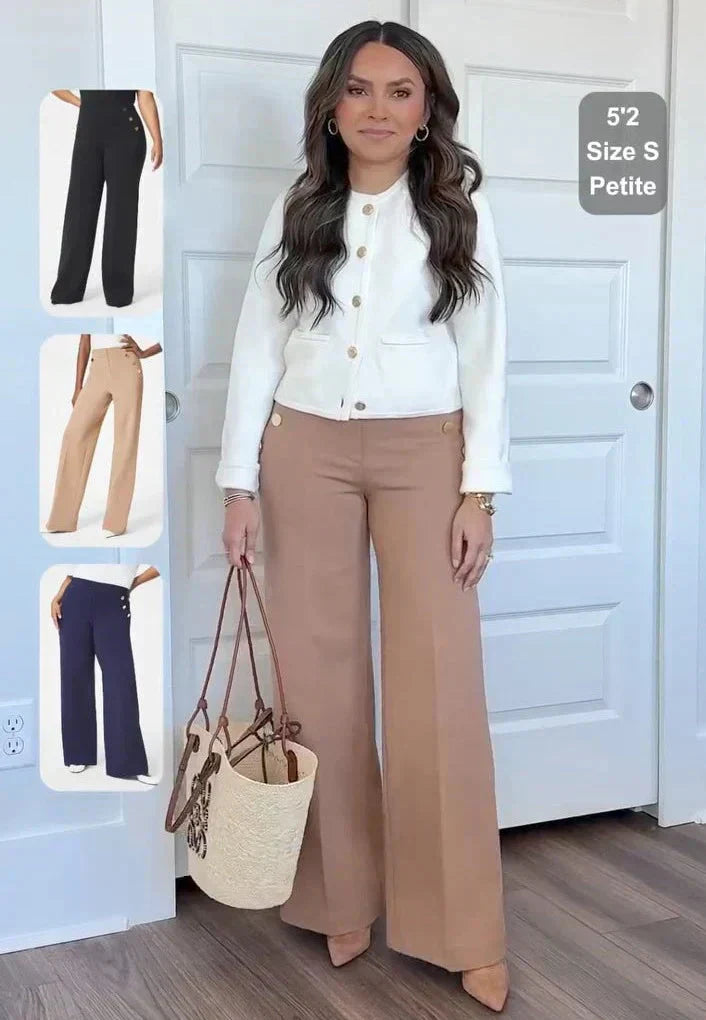 Ez a gépben mosható, széles szárú nadrág simító prémium ponte anyagból készült, kényelmes, húzózsinóros szabással és arany díszgombokkal.