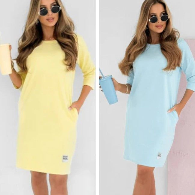 A csomag tartalma: 1* Kerek nyakú, hétnegyedes ujjú ruha zsebekkel