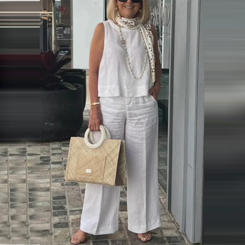 Klasszikus, mégis elegáns dizájn. A kerek nyakkivágás és az ujjatlan felső jól illik a széles szárú nadrághoz, így modern és elegáns megjelenést eredményez.